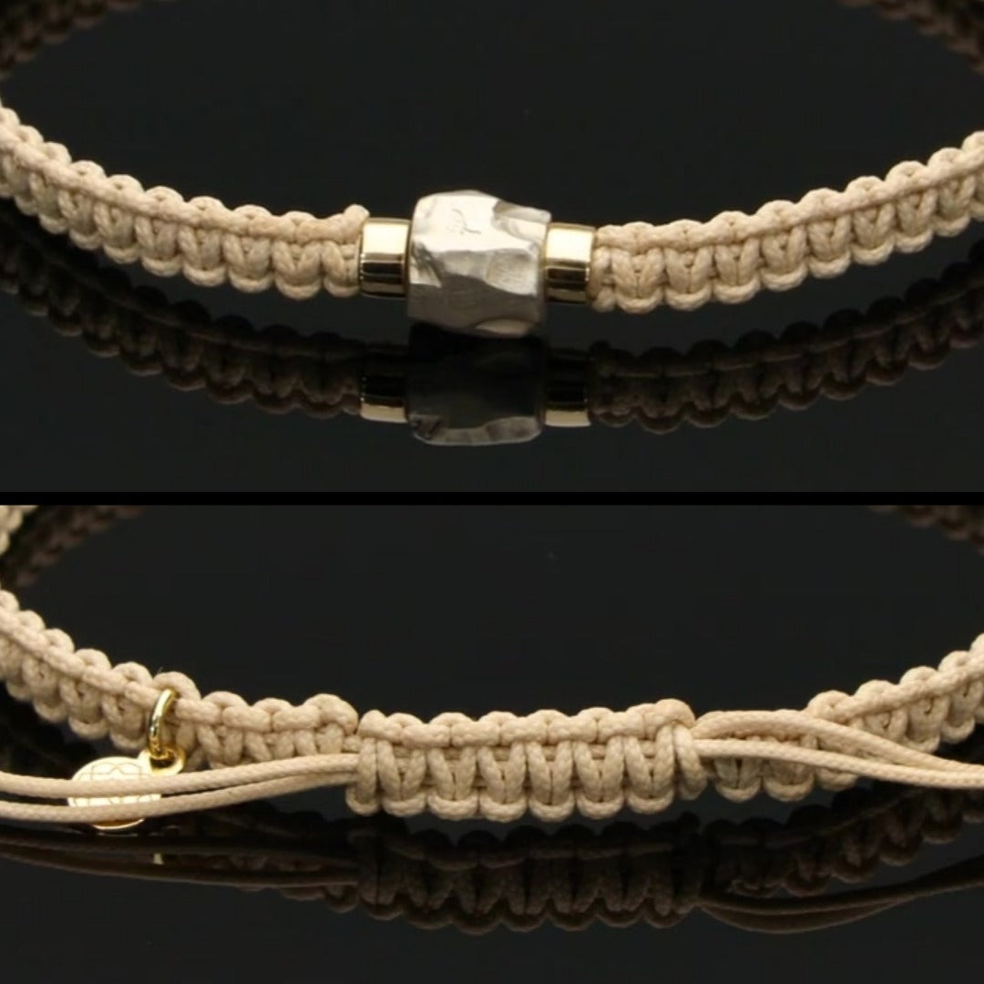 Das champagnerfarbene Makramee-Band aus feinster Perlseide verleiht dem Design eine harmonische, weiche Note und bringt die metallischen Akzente perfekt zur Geltung. Ein Statement aus Gegensätzen – präzise gefertigt und bis ins Detail durchdacht.